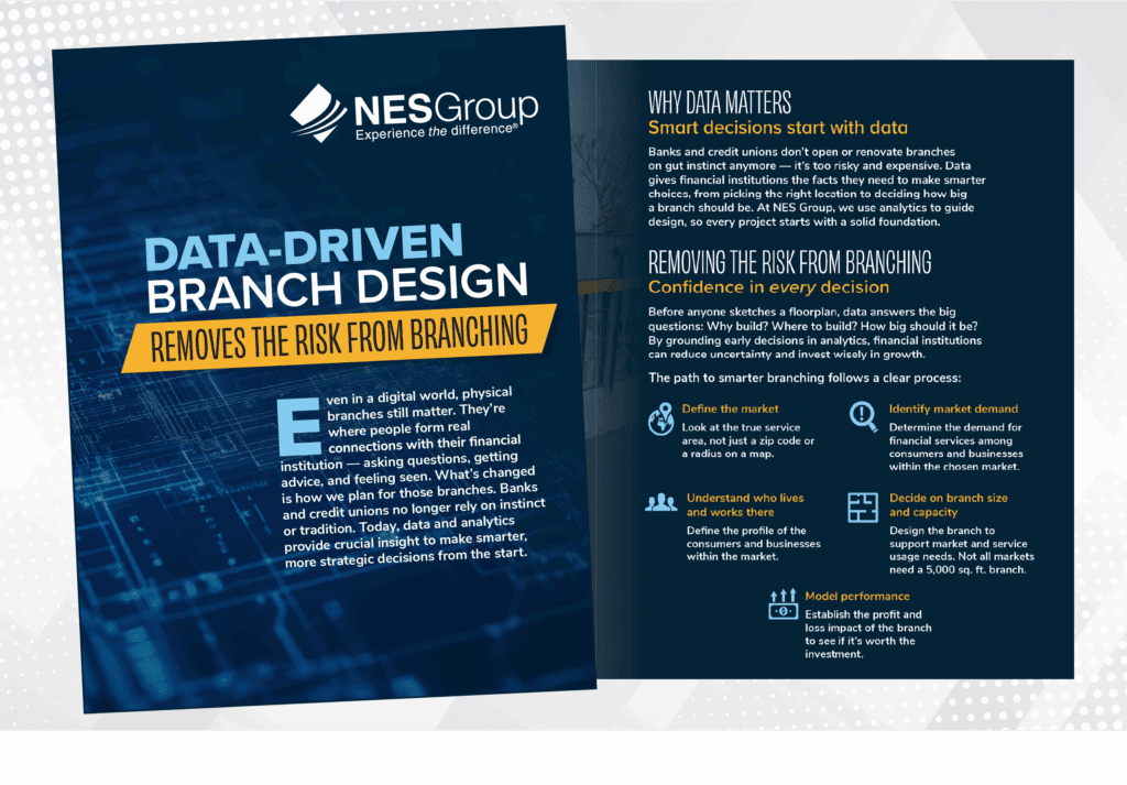 Banks and credit unions don’t open or renovate branches on gut instinct anymore — it’s too risky and expensive. Data gives financial institutions the facts they need to make smarter choices, from picking the right location to deciding how big a branch should be. At NES Group, we use analytics to guide design, so every project starts with a solid foundation.
