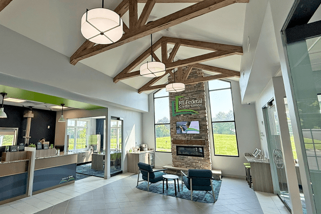 You can see this approach in action at Seneca Savings in Manlius, NY, where warm wood beams, abundant natural light, and cozy finishes create a home-like atmosphere—delivering a polished, high-end look without the high-end cost.